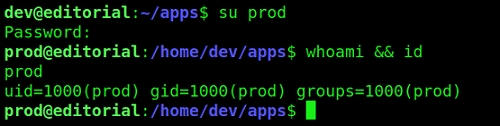 uid=1001(dev) gid=1001(dev) groups=1001(dev)